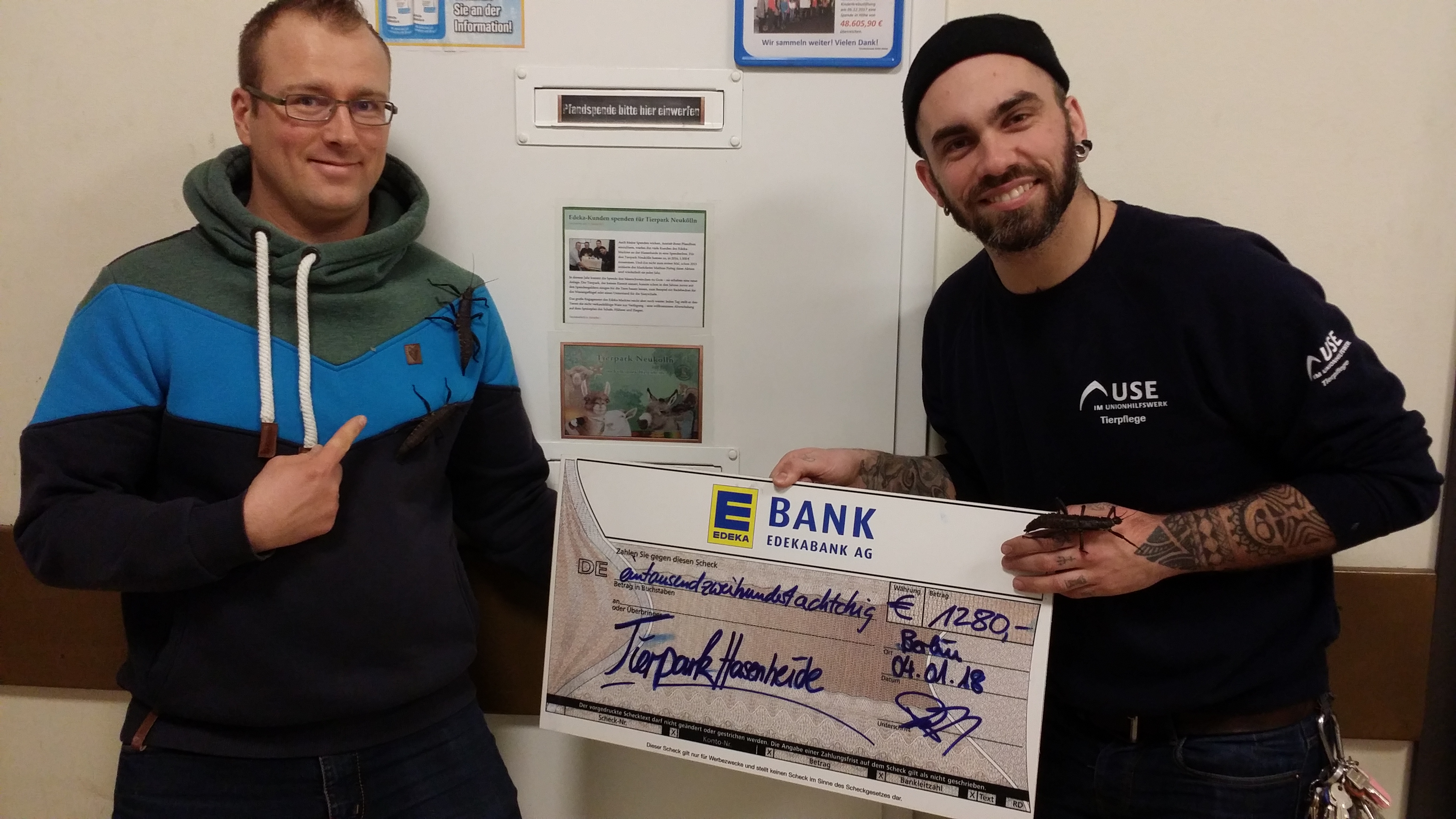 Es ist schon eine kleine Tradition. Einmal im Jahr übergibt Mathias Fiebig, Leiter des Edeka-Marktes an der Hasenheide eine großzügige Spende an den Tierpark Neukölln. Denn das Jahr über waren seine Kunden engagiert – anstatt ihre Pfandbons einzulösen, spendeten sie sie dem Tierpark Neukölln. So kam 2017 eine Summe von 1.280 € zusammen.